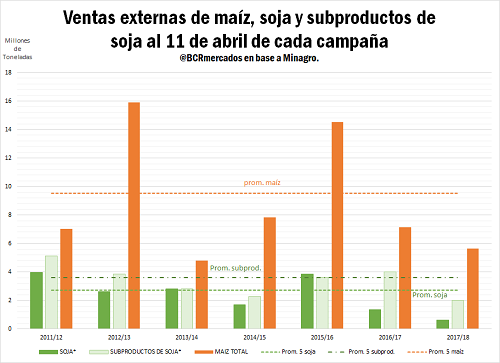 Frente a la incertidumbre productiva el mercado exportador se muestra muy cauto en la declaración de ventas, aunque se cree que los últimos cambios en el régimen de registro (y que permiten tributar derechos de exportación según la fecha efectiva de embarque) pueda darle aire a los negocios. Hoy las ventas externas tanto de soja como de maíz se encuentran sustancialmente por debajo no sólo de las de la campaña anterior, sino también del promedio de las últimas 5 campañas, a la misma altura del año. En efecto, las DJVE de poroto de soja llevaban al 11 de abril unas 611 mil toneladas, lo que representa el 45% de la campaña anterior a la misma altura y sólo el 25% del promedio de las últimas 5 campañas. En el caso de los subproductos de la oleaginosa se llevaban vendidas 2 MT, cuando el año pasado eran el doble. En el caso del maíz la situación es menos severa, con 5,6 MT, se lleva vendido un 79% de lo de la campaña pasada, y un 56% del promedio de las últimas 5.