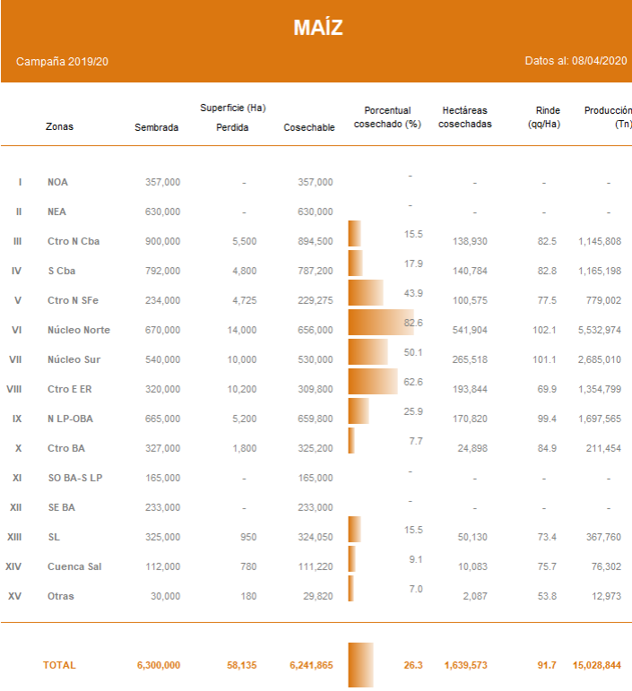 Hacia las zonas Oeste de Buenos Aires-Norte de La Pampa, Cuenca del Salado y el Centro de Buenos Aires las labores comienzan a retomarse en los sectores donde nuevamente puede transitar la maquinaria. Los rindes relevados se encuentran por sobre las primeras estimaciones realizadas a inicios de la campaña. En el Núcleo Norte la recolección avanza a buen ritmo sobre los planteos tempranos. Los rindes relevados superan los 100 qq/Ha en sectores de Córdoba y Santa Fe.