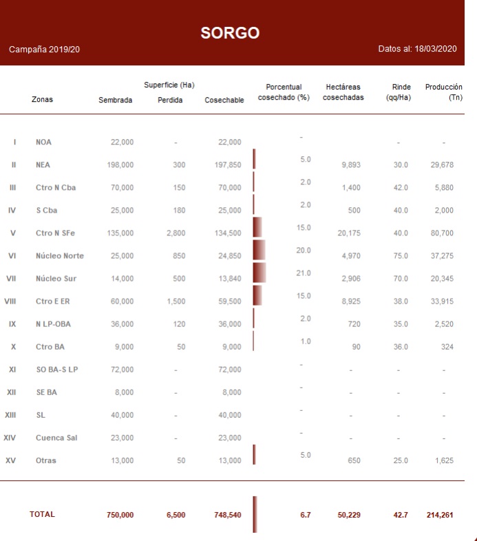 Durante las últimas dos semanas, la cosecha de cuadros de sorgo granífero continuó en el norte y centro del área agrícola nacional. Las labores se concentraron en las provincias de Córdoba, Santa Fe y Entre Ríos. A la fecha, el avance de las labores se ubica en el 6,7 % de un área estimada para la campaña 2019/20 en 750.000 Ha., un 2,8 % superior al ciclo previo (Superficie campaña 2018/19: 730.000 Ha.). En cuanto al rinde medio nacional el mismo se ubica en 42,7 qq/Ha, por lo cual mantenemos la actual estimación de producción de 2,5 MTn para el presente ciclo.