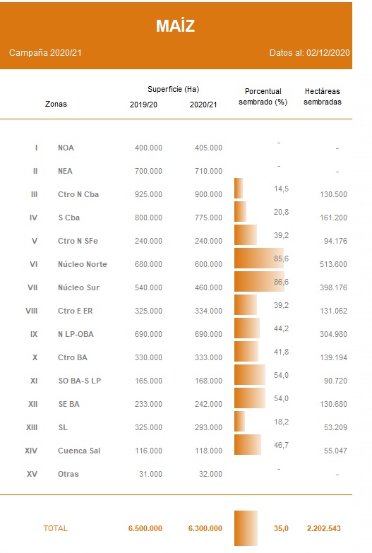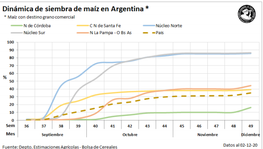 Durante los últimos días comenzó la incorporación de cuadros tardíos de maíz con destino gran comercial. Los mayores avances se relevaron en el centro del área agrícola, en lotes con buena humedad superficial producto de las lluvias registradas en el final de octubre. A la fecha ya se logró sembrar el 35 % de nuestra proyección para la campaña 2020/21 de 6.300.000 Ha. Esta superficie representa en números absolutos, 200.000 Ha menos que las implantadas la campaña previa (Campaña 2019/20: 6,5 MHa). El avance intersemanal fue de 3,1 puntos porcentuales y la demora interanual disminuye hasta los 13,7 pp