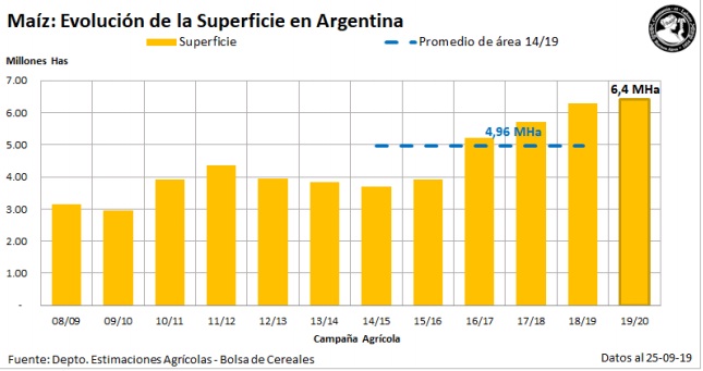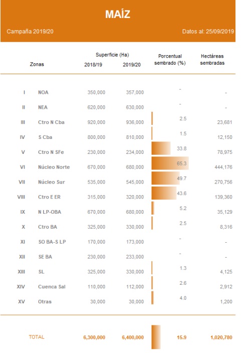 Luego de realizar análisis de imágenes satelitales a lo largo de toda el área agrícola nacional, realizamos ajustes en el área del cereal para las últimas dos campañas. Estas modificaciones impactaron en nuestra actual estimación de superficie de maíz con destino grano comercial para la campaña 2019/20. La nueva superficie se ubica en las 6.400.000 MHa, unas 100.000 Ha más que el ciclo previo (Superficie 2018/19: 6.300.000 Ha). A la fecha el avance de maíz total se ubica en el 15,9 %, luego de relevar un progreso intersemanal de 9,8 puntos porcentuales.