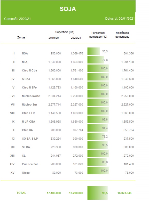 La siembra de soja logró cubrir el 93,5% de las 17.200.000 Ha proyectadas para la campaña en curso. Durante los últimos siete días se registró un progreso de 5,9 puntos porcentuales, reflejando un adelanto interanual de 0,3 puntos. Los mayores avances fueron informados sobre el NOA, el Sur de Buenos Aires y Sur de La Pampa, impulsados por las precipitaciones de los últimos diezdías. En números absolutos restan por incorporar casi 1,1 MHa concentradas sobre el extremo norte del país.
