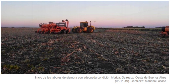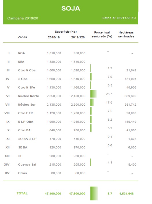 Durante la última quincena se ha dado inicio a la siembra de la campaña 2019/20, siendo el Núcleo Norte la zona más adelantada producto de la favorable condición hídrica de sus lotes. A la fecha se estima que el avance nacional de siembra cubrió un 8,7 % de los 17,6 millones de hectáreas proyectadas para la presente campaña, mostrando un leve atraso interanual de 0,7 puntos porcentuales.