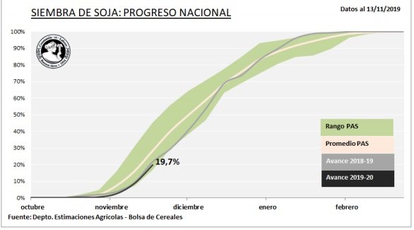 La siembra avanza alcanzando el 19,7 % de las 17,6 MHa proyectadas, manteniendo una demora interanual de -1,9 puntos.