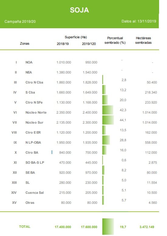 En contraposición, en el Sudeste de Buenos Aires, precipitaciones registradas desde principios de mes permitieron revertir lentamente el déficit hídrico, promoviendo un importante avance del área implantada al incorporar unas 74 mil hectáreas tan solo esta semana. Por su parte, el NEA registró precipitaciones acumuladas de hasta 140 mm contribuyendo a la recarga de los perfiles para enfrentar la campaña, la cual se estima dará inicio a comienzos del mes de diciembre.