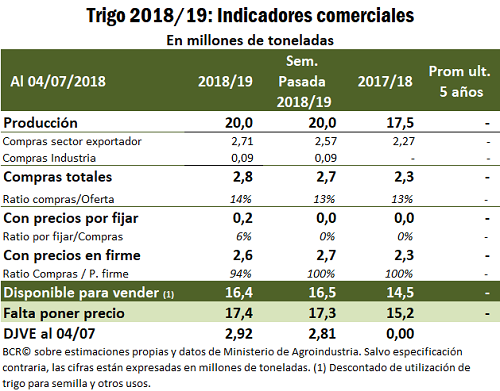La comercialización del trigo 2017/18 remanente mantiene el ritmo de las últimas semanas. Según cifras oficiales, a principios de julio se llevaba adquirido un 85% de la cosecha de trigo por parte de la exportación y la molinería. Las compras conjuntas de ambos sectores (14,8 Mt) son las más altas desde que se tiene registro (desde la campaña 1999/2000).