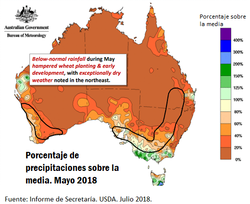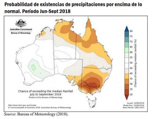 Los pronósticos de lluvias para los meses de julio a septiembre, de parte de la Oficina de Meteorología australiana, indican que se espera un invierno más seco que la media para la mayoría de las regiones del país. La perspectiva es que haya suficientes precipitaciones en las regiones de cultivo de Australia Occidental, región que contribuye significativamente a las exportaciones. Por otro lado, se espera que las temperaturas máximas sean más altas que el promedio en Australia meridional y occidental.