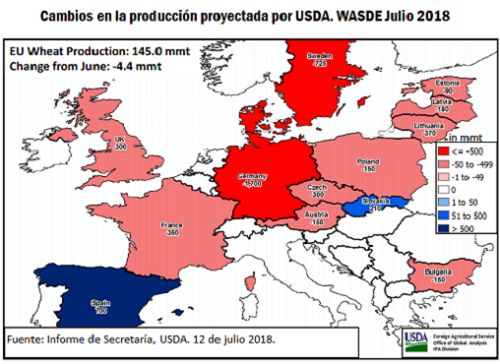 El jueves, Strategie Grains redujo su estimación de producción de trigo blando 2018 de la UE a 132,4 Mt, frente a los 139,9 Mt pronosticados hace un mes, 7% menos que la cosecha del año pasado. El recorte deviene de disminuciones combinadas por 5,8 Mt en las cosechas de Francia y Alemania, además de 2 Mt para el conjunto productivo triguero de Dinamarca, Grecia, Italia, el Reino Unido, Austria, Finlandia, Suecia, Polonia, Estonia, Letonia, Lituania y Bulgaria.