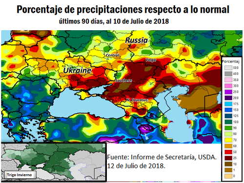 Las producciones de trigo de Rusia y Ucrania, campaña 2018/19, fueron recortadas por el USDA a 67 Mt (-1,5 Mt) y 25,5 Mt (-1 Mt), respectivamente. Precipitaciones muy por debajo de lo normal y un fuerte déficit hídrico en determinadas zonas se hicieron prevalentes en regiones claves productivas de trigo de invierno en la región del Mar Negro. Desde mediados de la primavera boreal, en los últimos 90 días, se han presentado zonas con precipitaciones que no superaron el 25% de la media histórica en la región meridional de Rusia.