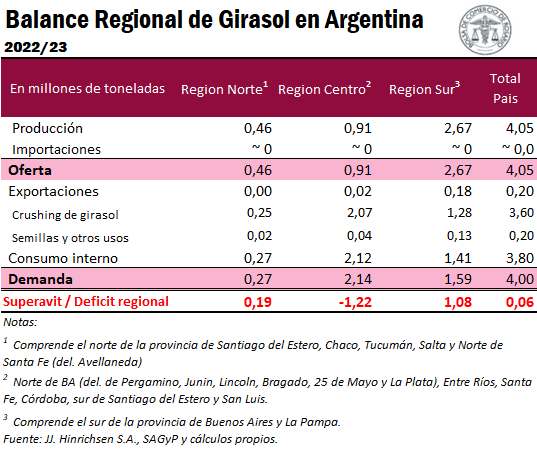 Los centros de consumo principales que generan este déficit regional serían General Deheza en Córdoba, Junín y Cañuelas en el norte de Buenos Aires y el Gran Rosario, en el sur de Santa Fe. Lo más probable es que este girasol provenga de La Pampa para Córdoba, muy posiblemente por la ruta 35. En cuanto a los polos de consumo del norte de Buenos Aires, es probable que del Centro-Sur bonaerense el grano fluya hacia Junín por la ruta 33, mientras que hacia Cañuelas lo haga por la ruta 3 desde el sur de la provincia. Para el Gran Rosario, es probable que el girasol requerido provenga del norte por las rutas 11 y 34, así como también parte desde el oeste y sur bonaerense por la ruta 33. Las exportaciones para la 2022/2023 desde la Región Centro se estiman en 20.000 toneladas, lo que refleja la posibilidad de exportación de algún buque con girasol desde el Gran Rosario o los puertos del norte de Buenos Aires.