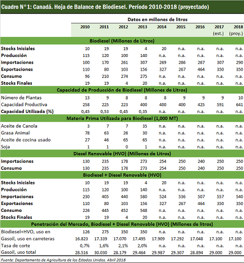 Resulta interesante observar la hoja de balance completa de Canadá, publicada por el Departamento de Agricultura de los Estados Unidos en su informe anual de biocombustibles