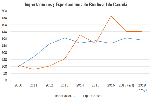 Canadá importa suficientes volúmenes de biodiesel para cumplir con requisitos provinciales de mezcla (que próximamente serán eliminados, apuntando a un enfoque de intensidad de carbono que reemplace al actual esquema de requisitos de mezcla mínimos). Su nivel de importaciones oscila desde el año 2013 en torno a los 290 millones de litros por año (que aproximadamente equivalen a 250 mil toneladas), y no se espera que cambie en 2018, tal como indican los datos del informe.