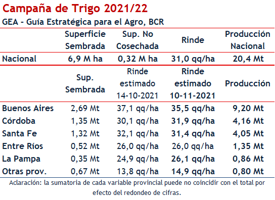En este ajuste mensual caen los rindes de Buenos Aires en 1,6 quintales, Santa Fe, en casi uno, y el volumen nacional triguero pierde 300 mil Tn de octubre a noviembre. Sin embargo, con un volumen estimado en 20,4 M ha la campaña triguera 2021/22 superará el anterior récord productivo del 2019/20 por casi 1 Mt. Siendo esta la mayor siembra de los últimos 19 años, con 100.000 ha más y con un rinde promedio nacional estimado con un quintal más que hace dos años, se espera un nuevo récord de cosecha para el trigo Argentino.