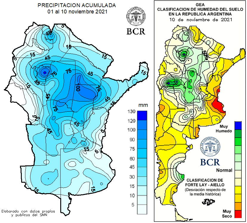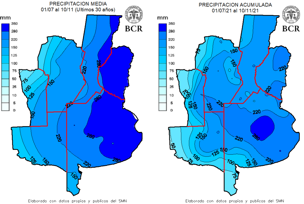Respecto a las medias de los últimos 30 años, desde el 1/7 al 10/11, Córdoba alcanzó en buena parte de la provincia los registros históricos. Pero en Santa Fe y Buenos Aires hay zonas con faltantes de 100 a 150 mm. También se nota el acopio de reservas en el centro de Buenos Aires que viene conteniendo los descuentos en los rindes estimados.