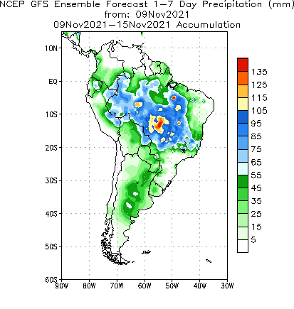 “El enfriamiento del Pacífico sigue presente y se ha acentuado en los últimos treinta días. El índice ONI lo expresa en la última actualización, pasando –0,7 respecto de –0,5 el mes anterior. Pero el régimen de lluvias de la región pampeana es la resultante de fenómenos de escala planetaria y fenómenos de escala regional“, dice Aiello. Y estos últimos están jugando a favor de Argentina, ya que estos fenómenos “han quebrado el patrón seco”, explica el consultor Elorriaga. “Los fenómenos regionales están posibilitando condiciones ambientales dominadas por masas de aire con alta carga de humedad. El aire húmedo incluso avanzó sobre el NOA. Finalmente, se tradujeron en las recientes lluvias y tormentas por el pasaje de sistemas frontales. Lamentablemente, esta dinámica atmosférica tiende a ser diferencial y en esta oportunidad poco generosa sobre la franja este“. Los pronósticos de corto plazo indican que el centro de baja presión que estuvo instalado sobre el centro del país y provocó lluvias sobre la franja oeste (y a la vez dificultó los desarrollos pluviales hacia el este) se desplazará hacia el sudeste, acompañado por un frente frontal que ingresará desde el sur del país. Esto favorecerá que las precipitaciones alcancen la franja este durante el fin de semana. Por el momento, los modelos numéricos no muestran que las lluvias se desplieguen con el mismo volumen de agua hacia el sudeste bonaerense. Eso dependerá de las condiciones de circulación y del grado de desplazamiento hacia el este que tenga el centro de baja presión que, por el momento, se mantiene estable sobre el centro del país. Podría tratarse de un evento muy importante para Argentina, con lluvias generalizadas y montos que mejoren significativamente las reservas edáficas de varias provincias para afrontar el ciclo de granos gruesos 2021/22. También podrían tener un gran impacto en Brasil, según lo señalado por la NOAA.
