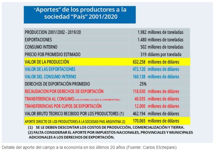 Sin embargo, Etchepare repara en que las retenciones, (a las que se deben sumar los otros impuestos nacionales, provinciales y municipales para tener un cálculo más aproximado al total aportado por el sector) no es el único “aporte” directo que el campo realiza a la sociedad, sino que también hay que tener en cuenta las transferencias que se realizaron en el lapso determinado al consumo a través de los derechos de exportación, como así también, a partir de los cupos de exportación que fueron utilizados durante gran parte de los gobiernos kirchneristas. Así, el aporte directo de los productores al país durante estos últimos 20 años llegaría a superar los USD 170.065 millones.