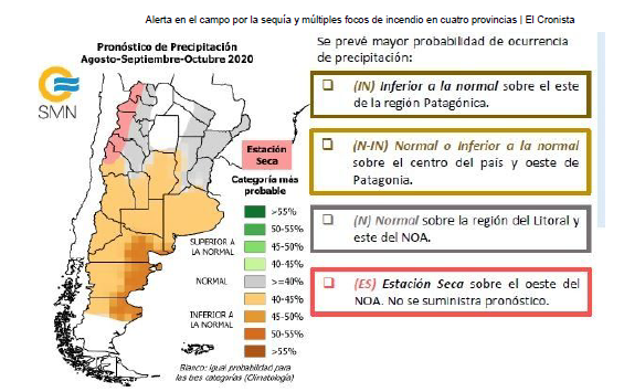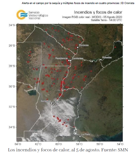 La falta de precipitaciones mantiene en alerta a los productores de varias provincias, donde a la sequía y falta de humedad en los suelos se suman focos de incendios, que se irradiaron en la última semana por distintas zonas de las provincias de Santa Fe, Chaco, Formosa, Entre Ríos y Corrientes.