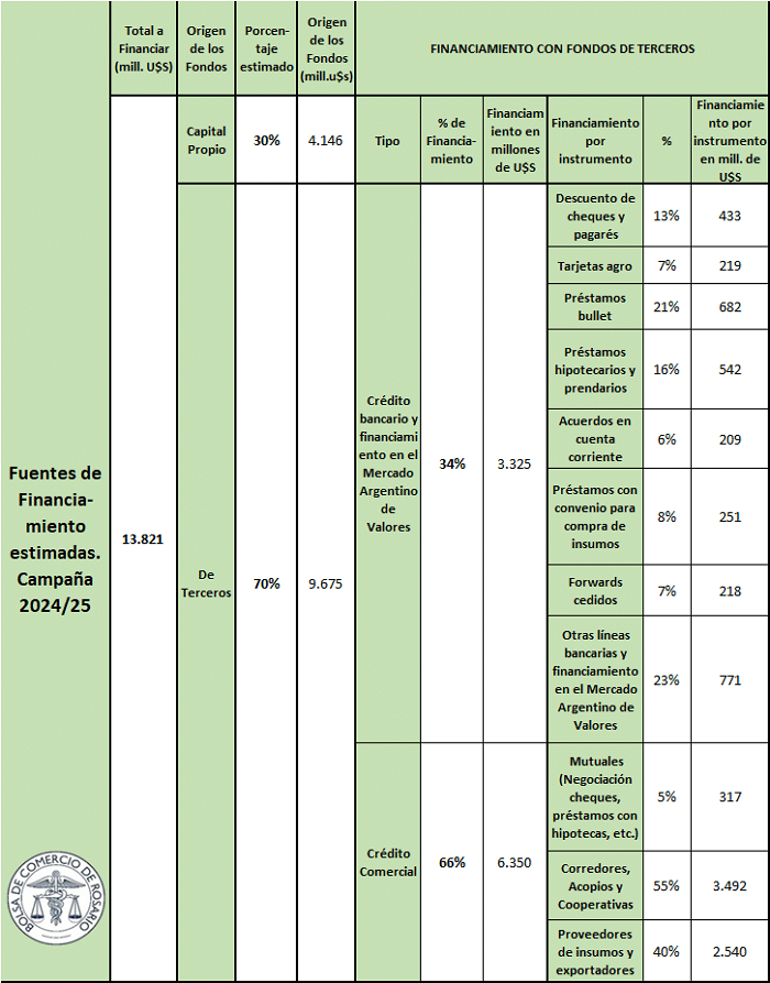 Según un informe elaborado por la Bolsa de Comercio de Rosario, los productores agrícolas destinaron US$ 13.821 millones para financiar la campaña 2024/25. El 70% de las inversiones se realizó mediante financiamiento externo, principalmente del circuito comercial, mientras que el 30% provino de capital propio.