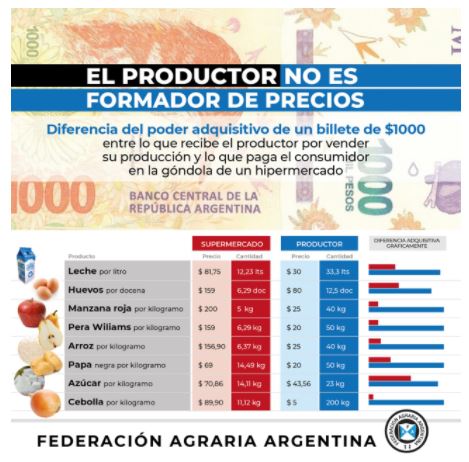 Para refutar la teoría que instala el gobierno ante la opinión pública, de que los productores son los principales responsables de las subas de precios, la organización dio a conocer un informe donde expone la diferencia entre lo que reciben los productores y el precio que se paga en la góndola.