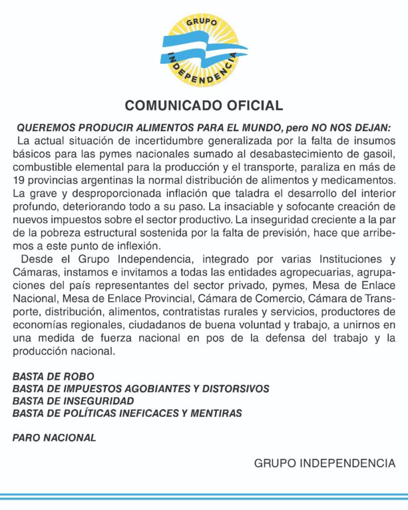 La difícil situación que atraviesa el sector productivo no solo desde el punto de vista agropecuario, sino también las Pymes en base al desabastecimiento de gasoil que redunda sin lugar a dudas en aumentos de los productos básicos de la canasta familiar.