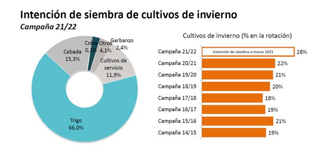 Al evaluar las intenciones de siembra de la campaña 2021/22, se observa un incremento de la participación de los cultivos de invierno en la rotación respecto de años anteriores. Además, casi un 12% del área prevista en el ámbito CREA corresponde a cultivos de servicio.