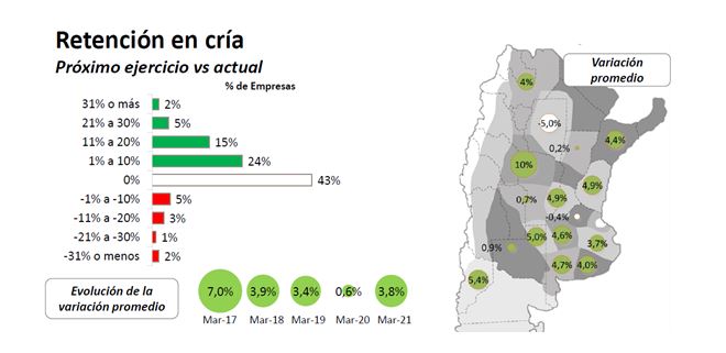 En cuanto a la ganadería bovina, en marzo de este año un 46% de los ganaderos encuestados manifestó planes para aumentar la cantidad de vientres, una cifra diez puntos superior a la del mismo mes de 2020. En promedio, las empresas de cría aumentarían la cantidad de vientres por entorar un 3,8%, mientras que en marzo de 2020 el incremento medio esperado era del 0,6%.