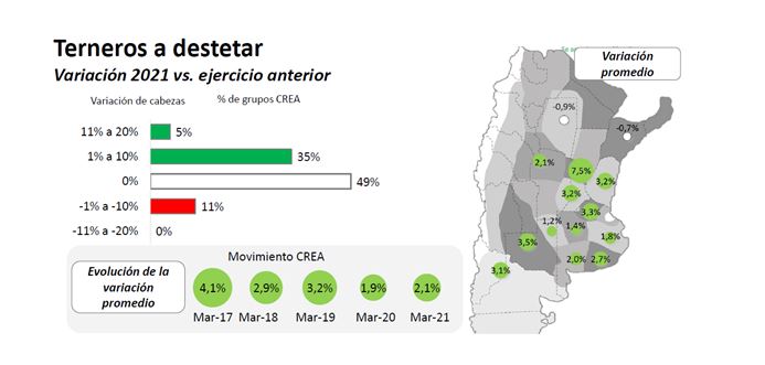 En el 40% de los grupos CREA se planea incrementar la cantidad de terneros por destetar con relación al ejercicio anterior. A pesar de las dificultades generadas por las restricciones hídricas presentes en muchas regiones ganaderas, el destete promedio aumentaría un 2,1% en 2021 respecto del año anterior.