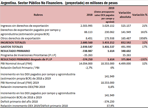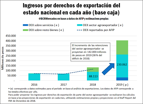 Estos $ 142.000 millones representan el 0,8 % del PBI proyectado para el año 2019. Comparando estos $ 142.000 millones adicionales en el 2019 con el déficit primario registrado en el año 2018 ($ 374.250 millones), equivale a cubrir casi el 40 % de dicho déficit del 2018. Es un aporte adicional significativo de los hombres y mujeres de campo y la agroindustria, que se suman al resto de los impuestos que pagan por su actividad (impuesto a las ganancias, a los bienes personales, ingresos brutos, tasa vial para mejora de caminos, tasas comunales, tasas para el mantenimiento de comités hídricos, impuesto inmobiliario rural, impuesto a los débitos y créditos bancarios, Impuesto a la transferencia a los combustibles, etc).