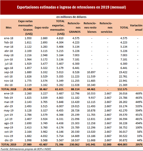Respecto al déficit del año 2018, calculado en 2,7 % del PBI según la meta del FMI (y similar a lo efectivamente obtenido si sumamos los gastos por el Programa de Inversiones Prioritarias, P.I.P.), el aumento en las retenciones a las exportaciones del sector agroindustrial equivale a un 38% del déficit de 2018. En conjunto, el aumento total de las retenciones significaría un incremento de los ingresos igual a 271.428 millones de pesos equivalentes al 1,5% del PBI en 2019. Según estos cálculos el ingreso es 2 p.p. mayores a la proyección hecha en el informe anterior del FMI de Diciembre. Hay que destacar que la clave para la obtención de este ingreso es el monto total de exportaciones. El total proyectado en el informe del FMI de diciembre de 2018 fue de 71.400 millones de dólares, escenario base para el cálculo de dichos montos.