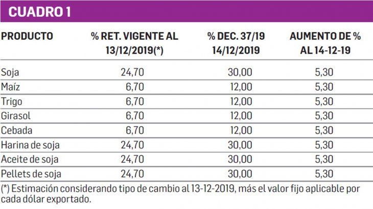 En el caso de granos y oleaginosas se exponen las variaciones establecidas por el Decreto 37/2019 en el cuadro que se transcribe a continuación. (Ver cuadro 1).