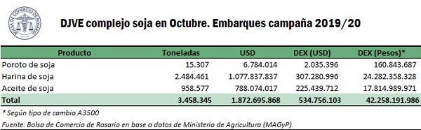 En total, se anotaron Declaraciones Juradas de Ventas al Exterior (DJVE) para embarques hasta el mes de diciembre por un total cercano a 3,45 millones de toneladas de productos del complejo (sumando poroto, harina/pellets y aceite de soja), unos US$ 1.872 millones en ingresos, generando un total estimado de $ 42.258 millones en recaudación por DEX al Estado Nacional.