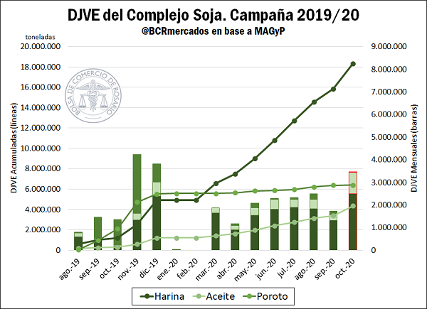 El grueso de las DJVE en términos de volumen correspondió a negocios de harina de soja. En total, se anotaron casi 2,5 millones de toneladas de harina para su embarque antes de fin de año, un 70% por encima de lo anotado en octubre del año previo. Las DJVE de harina alcanzan así 18,3 millones de toneladas en lo que va de la campaña, aun un 15% por debajo de la 2018/19. El producto que menor volumen de negocios concentró fue el poroto de soja, dado que se anotaron apenas 15.000 toneladas en el mes, de modo que lo vendido hasta la fecha (6,43 millones de toneladas) ya es más del 90% del total de exportaciones proyectadas para la campaña (7 Mt).