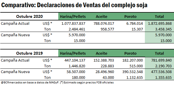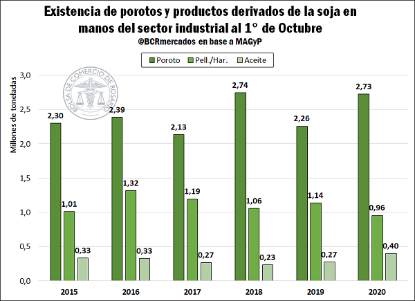 Al primero de octubre, los stocks de soja en manos del sector industrial se ubicaban en 2,7 millones de toneladas, un 20% por encima del año previo, aunque por debajo de 2018. Los stocks de harina se encontraban a esa fecha incluso por debajo del valor de los últimos cinco años con 0,95 Mt. El stock de aceite, producto de la fuerte baja en la demanda para producción de biocombustibles, se ubicaba el 1 de octubre casi un 50% por encima de 2018.