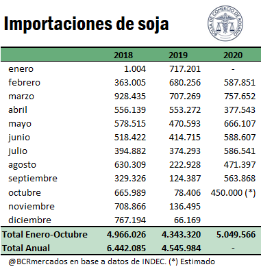 En cuanto a la mercadería importada, se observa un incremento en el flujo comercial en lo que va del año. En el mes de septiembre, se importaron cerca de 563.000 toneladas de soja, principalmente del Paraguay, tres veces por encima del mismo mes del año previo, al mismo tiempo que se estiman importaciones por entre 400.000 y 500.000 toneladas para el mes de octubre. En total, la estimación de importaciones para los primeros 10 meses del año arroja 5 millones de toneladas de soja.