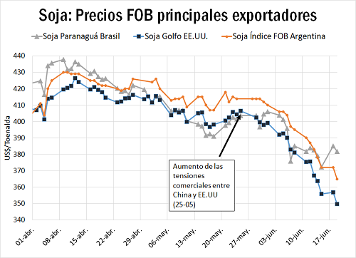 El precio de la soja disponible en dólares cae más de 15,5 USD / t en lo que va del mes de junio. Lo mismo ocurrió con el maíz, cayendo 6 USD / t en una semana. La caída en el precio se da luego de la escalada en el conflicto comercial entre China y EE.UU. La menor demanda de la oleaginosa de EE.UU se desvía hacia Sudamérica bifurcándose y recayendo con mayor fuerza sobre los puertos brasileños.