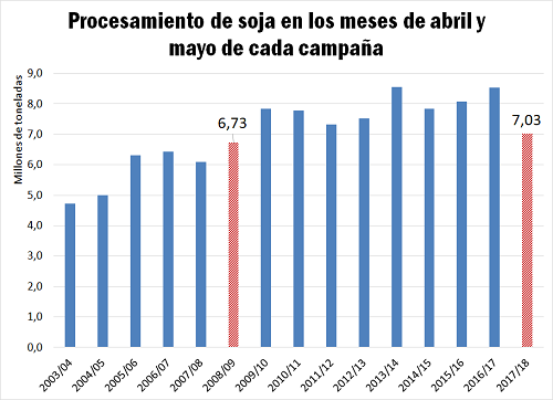 El crushing acumulado en los meses de abril y mayo es el más bajo desde la campaña 2008/2009, sumando un poco más de 7 millones de toneladas, producto de la sequía local a pesar de un aumento de las importaciones de soja en la actual campaña. El combinado de importaciones de poroto de soja en los meses de abril y mayo alcanza 1,14 Mt.