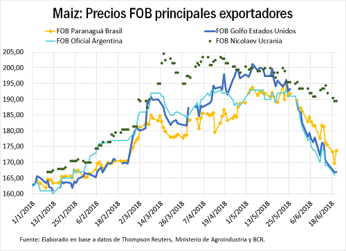 En cuanto a la comercialización en Argentina, el maíz lleva un ritmo muy elevado, según se desprende de los datos relevados por el Ministerio de Agroindustria al 13 de junio. De lo acumulado en la campaña 17/18 se observa que el sector exportador lleva adquirido 12,84 Mt mientras que las DJVE (compromisos de exportación) alcanzan 12,96 Mt. Es decir, el sector exportador posee más compromisos de ventas externas que lo realmente adquirido lo que demuestra una demanda que sigue siendo robusta por el cereal argentino. Justamente son los precios externos los que limitan el potencial alcista que tiene el precio del maíz. El precio del maíz FOB cayó 26 USD / t a 166 USD /t desde el máximo alcanzado el 23 de mayo.