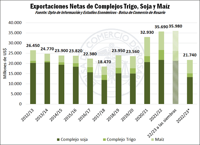 Respecto a las exportaciones netas de los complejos trigo, soja y maíz, ello es, incluyendo los despachos de aceites, harinas, biodiesel, y demás productos obtenidos por el procesamiento de los granos, la proyección de ingreso de divisas para la campaña 2022/23 cae a US$ 21.740 millones, US$ 13.950 millones por debajo de la anterior campaña 2021/22 y US$ 14.240 millones por detrás de lo que se proyectaba al momento de las siembras, en septiembre de 2022.