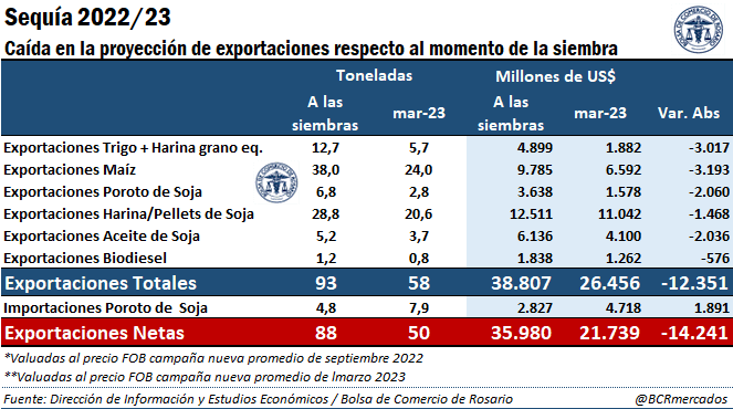 Valuando las cantidades proyectadas en septiembre a los precios vigentes en ese momento, en comparación con las proyecciones y precios al día de la fecha, la caída en el valor estimado de las exportaciones netas 2022/23 como consecuencia de la sequía y atribuibles a los complejos soja, maíz y trigo asciende a US$ 14.240, o un 40% de lo proyectado hace apenas un semestre.
