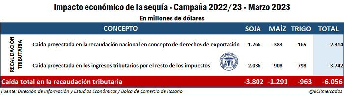 Sumando ambos conceptos, la masa tributaria ha perdido a la fecha US$ 6.056 millones como consecuencia del impacto de la sequía sobre los cultivos de trigo, soja y maíz.