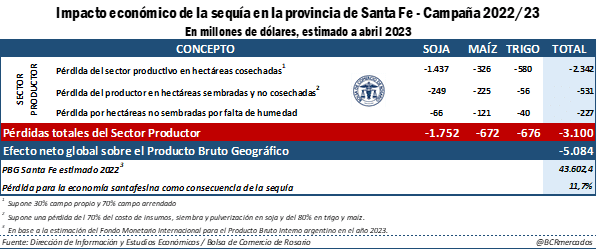 Mucho se ha hablado de las pérdidas que deja la campaña 2022/23 por la combinación de sequía por tercer año consecutivo con heladas a destiempo y olas de calor persistentes ya pasado el verano. Como resultado, no sólo la cosecha ha resultado dañada, sino que este impacto para el productor se traduce en menos viajes y pagos de fletes, mayor costo para la producción de leche, pérdidas ganaderas, menor inversión en maquinaria y construcción, menor actividad comercial en el puerto, entre otras, todas actividades con un fuerte epicentro en la provincia de Santa Fe.