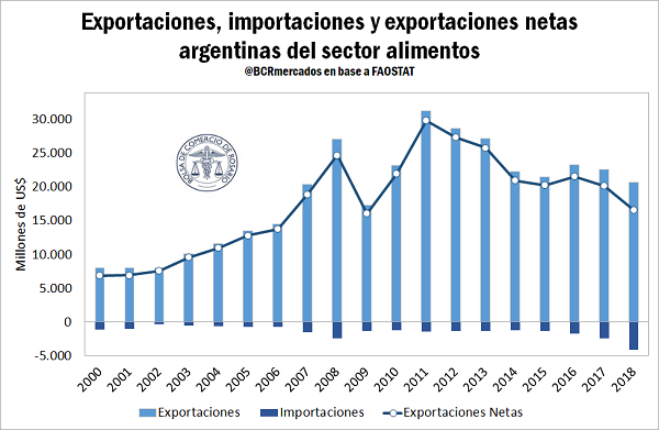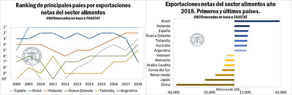 Argentina se ubica en séptima posición en el ranking de exportaciones netas de alimentos (excepto pescado) en 2018, con un total de US$ 16.579 millones, lo cual comparado con el resultado de US$ 6.893 millones registrado en el año 2000, representa un aumento del 141% en el período. Además, es menester destacar que desde el comienzo del milenio hasta el 2017, Argentina ha oscilado entre la segunda y la cuarta posición en la lista de exportadores netos de alimentos, siendo el 2018 el año en el que alcanzó su menor marca para el período analizado.