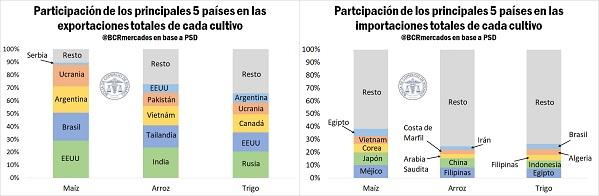 Los flujos comerciales presentan una formidable variabilidad entre regiones y tipos de commodities. Si bien en términos de valor, la categoría de frutas y vegetales es la que tiene mayor preponderancia, el rubro más comerciado en términos de volumen es, ampliamente, el de los cereales. Este grupo en particular presenta una notoria concentración exportadora, dado que los cinco países exportadores líderes en los tres principales granos (arroz, maíz y trigo) acaparan entre un 65% y un 89% del total. Sin embargo, del lado de las importaciones, la concentración es marcadamente menor, y los cinco principales países importadores representan entre un 38% y un 25% del total.