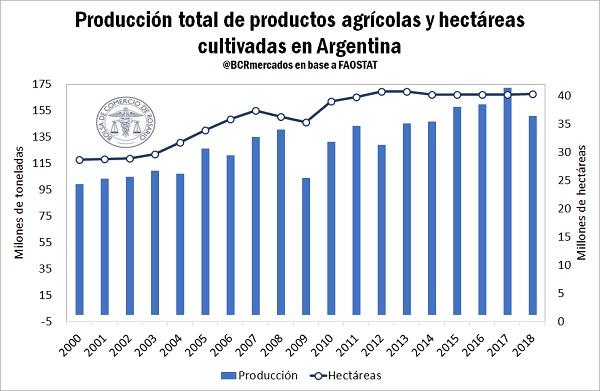 Durante el período 2000-2018, el área total destinada a la producción agrícola creció un 5%, alcanzando 1,6 billones de hectáreas a nivel global. No obstante, el ritmo de ampliación de la frontera agrícola fue menor al ritmo de crecimiento poblacional, por lo que la cantidad de hectáreas cultivadas per cápita disminuyó durante dicho período. De todas maneras, el incremento en la producción agrícola por encima de la ampliación de la superficie cultivada total sugiere un uso más eficiente de los recursos, mayores inversiones y aumentos en los rindes por mejores paquetes tecnológicos. En Argentina, por ejemplo, el área cultivada experimentó una fase de marcado aumento entre el 2000 y el 2012, para luego estabilizarse en los años subsiguientes. Sin embargo, la producción total siguió aumentando a pesar del estancamiento en el área cultivada, ya que se observa que la mayor producción se obtuvo en 2017, con un total de 172 Mt de productos agrícolas (cereales, oleaginosas, tubérculos, frutas, verduras, caña de azúcar, entre otros).