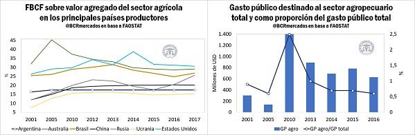 Por su parte, el gasto del Estado en la agricultura da cuenta del apoyo financiero del sector público que sirve para complementar las inversiones del sector privado. A diferencia de lo observado con la FBCF privada, es en los países de menores ingresos donde el gasto público del Estado destinado al sector agrícola representa una mayor proporción del total de las erogaciones del sector público. Para el caso argentino, durante la última década se reconoce una clara reducción en la preponderancia del sector agrícola dentro de la repartición de fondos públicos. En 2010 los fondos públicos destinados al sector representaban un 2,5% del gasto público total, mientras que en 2018 esta participación cayó al 0,4%.