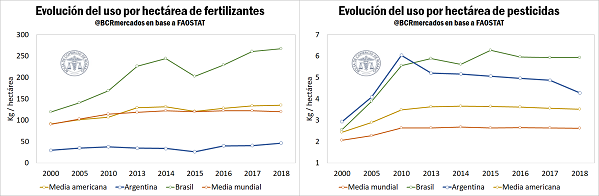 Otro factor determinante en la producción es el uso de pesticidas, agroquímicos y fertilizantes. Para el periodo de análisis (2000-2018), el uso total mundial de pesticidas aumentó en un 33%, aunque la mayor parte del incremento ocurrió en el período 2000-2012, observándose un amesetamiento en los años posteriores. En nuestro país, se observa un aumento en su uso total del 105% en 18 años, y un incremento del 46% en el uso por hectárea (2,94 kg/ ha en el 2000 vs. 4,29 kg/ha en 2018). Distinto es el caso del uso de fertilizantes, para el cual Argentina registra una marca muy moderada. Utilizando como parámetro la cantidad de nitrógeno, fósforo y potasio aplicados por hectárea, en el país se aplicaron en 2018 47 kg/ha, lo cual se encuentra por debajo de la media mundial (120,4 kg/ha), y también por debajo de la media de la región (135,3 kg/ha). Es muy llamativo el uso de fertilizante que ocurre en Brasil (267,5 kg/ha), siendo que duplica con creces la media mundial.