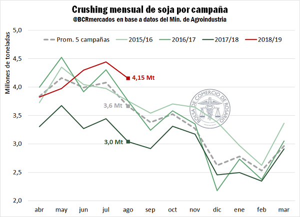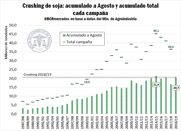 La actividad de la industria de la oleaginosa acompaña a la recuperación productiva de la campaña 2018/19. En el quinto mes de la campaña que comienza en abril en Argentina, las fábricas llevan procesadas 20,7 millones de toneladas de soja, la segunda mejor marca en la historia para este momento del año. El volumen actual industrializado al mes de agosto sólo fue mejorado el ciclo 2014/15, cuando se industrializó la cantidad récord de 45,1 Mt en todo el ciclo.