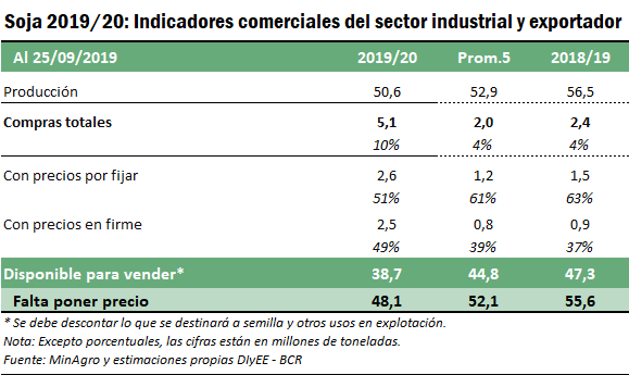 Pese al menor interés relativo por negocios con soja 2019/20 en lo que va de octubre, en el acumulado a la fecha se registran volúmenes muy superiores a los habituales. Al 25 de septiembre, Agroindustria informó compras de industria y exportación de 5,1 Mt de soja 2019/20, más que duplicando el promedio comprado a igual fecha en los últimos 5 ciclos. El volumen comprometido por los productores representa el 10% de la producción estimada para la campaña, una proporción también muy por superior a las cifras de los últimos años.