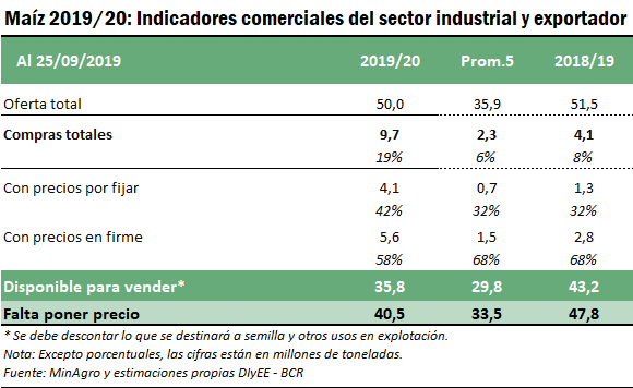En el mercado del maíz, las compras del cereal 2019/20 también muestran una importante diferencia con las adquisiciones a igual fecha en ciclos pasados. A fines de septiembre, la exportación y la industria llevaban compradas 9,7 Mt de maíz nuevo que equivale al 19% de la producción estimada para la campaña. El volumen ya comprometido es cuatro veces mayor al promedio comercializado de maíz nuevo a esta altura de las últimas 5 campañas.