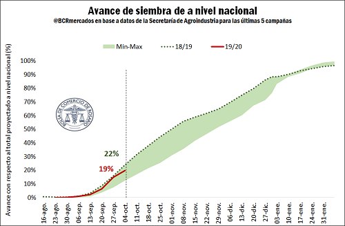 Según datos oficiales, el ritmo de siembra a nivel nacional de la campaña 2019/20 que resultaba muy similar al de la campaña anterior hasta fines de septiembre, comienza a mostrar un retraso en relación a aquel en las últimas jornadas. El motivo de ello es principalmente el déficit hídrico que afecta algunas regiones claves de las provincias de Córdoba y Buenos Aires. Tal como muestra el gráfico adjunto, a nivel nacional el progreso al 03 de octubre alcanza el 19% del área de intención, por debajo del 22% que se alcanzaba a la misma altura del año 2018 aunque aún por encima del 16% promedio de las últimas cinco campañas.